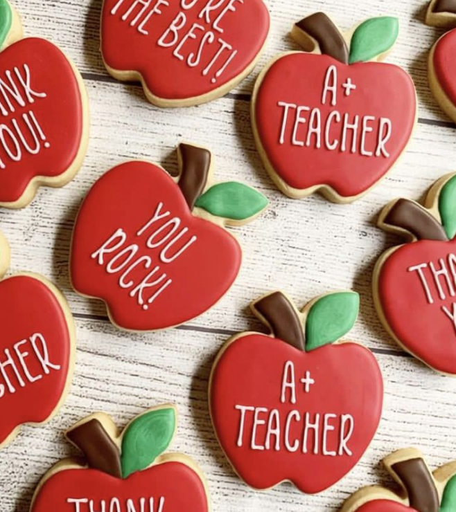 Simple yet heartfelt, these red apple-shaped cookies are decorated with messages like “A+ Teacher” and “Thank You” to express gratitude in the sweetest way. Ideal for teacher appreciation or school celebrations, they are available in a 10-piece set with five designed gingerbread cookies and five plain cookies, or a 20-piece set with ten designed gingerbread cookies and ten plain cookies.