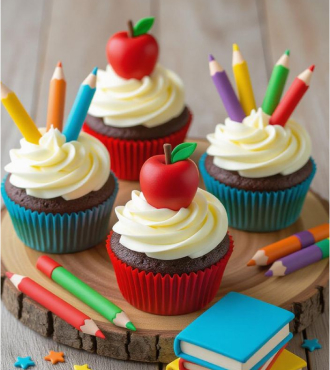 These cupcakes feature creamy frosting in bright colors, topped with fondant apples and pencils for a fresh, back-to-school aesthetic. Available in chocolate, Oreo, strawberry, red velvet, and coconut flavors, they are perfect for sharing with classmates or staff.