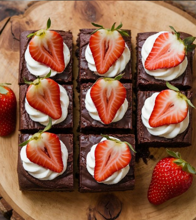 Luscious brownies are topped with a swirl of fresh whipped cream and crowned with juicy strawberries. The combination of rich chocolate, airy cream, and fruity freshness creates a refreshing yet decadent treat.
