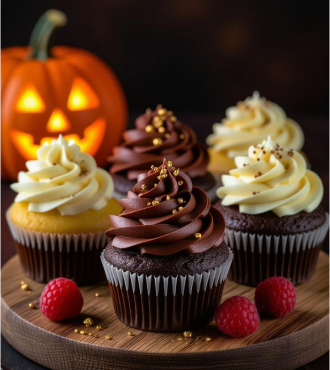 A refined mix of cupcakes adorned with smooth frosting and golden sprinkles. Their soft crumb and balanced sweetness make them a luxurious yet festive indulgence, ideal for sophisticated Halloween gatherings.