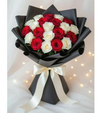A dramatic bouquet of red and white roses, wrapped in striking black paper and finished with a white satin ribbon. Perfect for those who love bold elegance and timeless romance, especially when you send flowers in Dubai. Depending on availability, components such as vase or hatbox color and design, may vary.