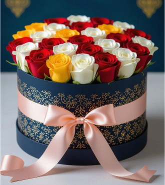 A sophisticated hatbox adorned with roses in rich red, golden yellow, and pure white shades — a celebration of love, joy, and harmony. Every rose adds its own emotion, resulting in an arrangement that’s both bold and timeless, perfect for gifting or elevating any special occasion.