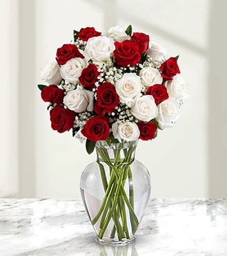 Experience the epitome of refined luxury with our Bold Elegance Bouquet. This exquisite arrangement features a captivating combination of white and red roses, meticulously arranged inside our sophisticated vases. The contrasting colors create a striking visual impact that is both bold and elegant. Fresh fillers add texture and depth, enhancing the overall beauty of the bouquet. Whether it's a romantic gesture or a sophisticated gift for a loved one, this bouquet exudes confidence and timeless charm.