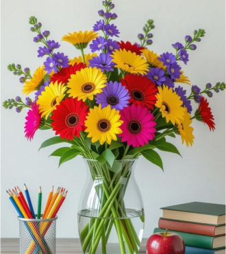 An uplifting mix of yellow, red, pink, and purple gerbera daisies bursts with cheerful energy, making it the perfect way to kick off the school year. Arranged in a transparent vase, these vivid blooms radiate enthusiasm and creativity, just like the start of a new academic adventure.