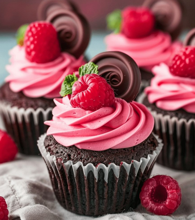 Rich chocolate cupcakes topped with smooth pink frosting, fresh raspberries, and elegant chocolate curls. The combination of tart berries and deep cocoa notes creates a perfect harmony of flavors, offering a dessert that’s as beautiful as it is delicious.