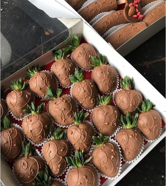 Succulent strawberries are dipped in smooth milk chocolate and decorated with intricate swirl designs for a refined finish. The balance of creamy cocoa and fresh fruit makes them a perfect choice for elegant gifting or indulgent snacking.