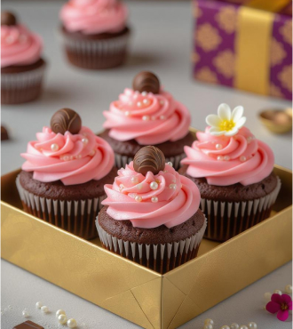 Indulgent chocolate cupcakes topped with soft pink frosting and finished with chocolate truffles and pearls. The rich, smooth texture melts perfectly on the tongue, radiating sweetness and joy in every swirl.