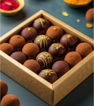 Richly crafted with velvety ganache and cocoa-dusted shells, these truffles offer deep chocolate notes balanced with smooth texture and elegance. A festive delight for true connoisseurs. Box design may vary based on availability.