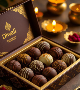 An exquisite blend of milk, white, and dark chocolate truffles handcrafted with artistic swirls and dusted finishes. Their creamy centers and rich flavor layers offer a truly indulgent Diwali experience. Box design may vary based on availability.