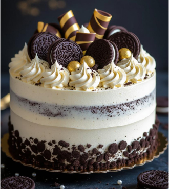 A cookies-and-cream dream layered with fluffy sponge, creamy frosting, and crunchy cookie crumbs. Adorned with swirls, golden pearls, and chocolate curls, it’s a beautifully textured dessert that satisfies both elegance and flavour.
