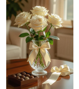- 5 cream roses in a crystal-clear vase with a satin ribbon