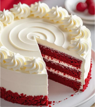This stunning red velvet cake features beautifully moist layers paired with a rich cream cheese filling. Its elegant design is crowned with swirls of frosting and a scattering of red velvet crumbs that add both flavor and visual charm. Perfect for any special occasion, this cake promises to impress with its striking appearance and irresistible flavor.