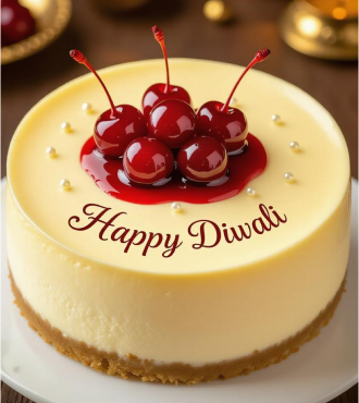 Enjoy a creamy treat with a golden base, topped with glossy crimson drizzles and juicy red orbs. Pearl accents add a touch of elegance, blending crumbly edges with a rich, fruity center. A treat perfect for your Diwali celebrations.