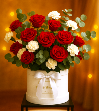 This timeless hatbox arrangement features a striking blend of lush red roses, delicate white blooms, and eucalyptus accents. Elegantly presented in a white box with a satin bow, it's a refined and romantic gesture perfect for heartfelt occasions.