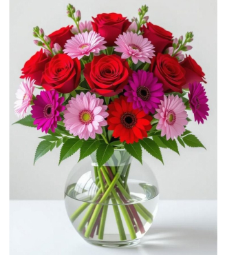 A harmonious blend of deep red roses, delicate pink daisies, and vibrant purple blooms, arranged in a simple yet striking vase. This bouquet is the ultimate expression of affection, with colors that speak of passion, tenderness, and admiration, making it a perfect gift for any celebration of love. Ideal for those looking for flower delivery Dubai. Depending on availability, components such as vase color and design, may vary.