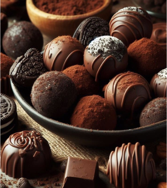 Decadent truffles covered in Belgian chocolate and dusted with rich cocoa, with some topped with crushed cookies for added texture. These indulgent bites combine smoothness and crunch, making them a satisfying treat for true chocolate lovers.