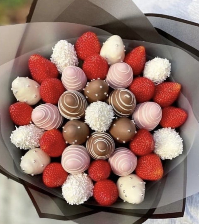 A delightful bouquet featuring a mix of fresh strawberries and those coated in milk, white, and pink chocolate with decorative drizzles, pearls, and coconut. The variety in flavors and textures offers a truly indulgent experience for any special occasion.