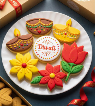 An artistic mix of hand-iced cookies shaped like diyas, flowers, and festive symbols in bright gold, red, and yellow hues. These buttery cookies are perfect for gifting or sharing. Available in two options: 10-piece (five gingerbread + five plain) or 20-piece (ten of each) for gatherings and celebrations.