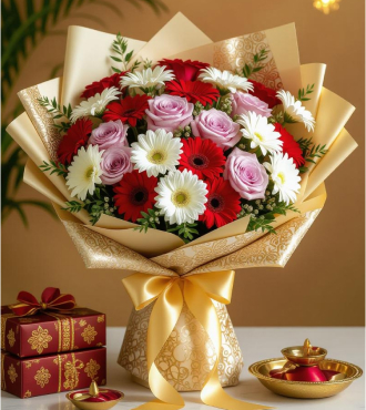 Wrapped in golden luxury, this bouquet of red gerberas, white daisies, and blush pink roses captures the essence of Diwali elegance. A thoughtful floral gift to brighten hearts and homes during the festival of lights.