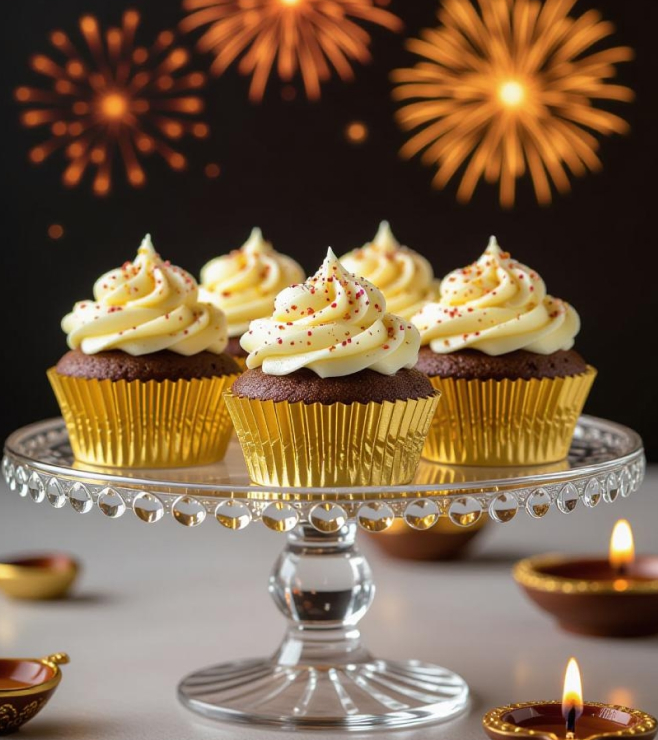 Wrapped in golden liners and topped with smooth swirls of ivory frosting, these cupcakes capture the glow of festive lights in every detail. Their soft, moist texture and creamy richness make each bite a celebration of joy and indulgence.