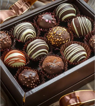 This box of handcrafted chocolate truffles features an indulgent variety of rich, velvety treats adorned with drizzles, sprinkles, and gold accents. Encased in a sleek gift box, it's a luxurious pick for anyone who appreciates fine chocolate.