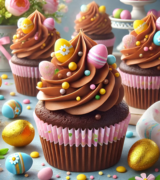 A joyful explosion of color and chocolatey goodness, these cupcakes are topped with fluffy chocolate frosting, mini pastel Easter eggs, and playful candy sprinkles. Whether for a party or a personal indulgence, these treats bring a burst of spring cheer and come in five scrumptious flavors: chocolate, Oreo, strawberry, red velvet, and coconut.