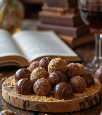 A sophisticated mix of truffles covered with rich Belgian chocolate in a variety of textures, from velvety cocoa dust to smooth chocolate glaze and crunchy coatings. Each piece offers a unique indulgent experience.
