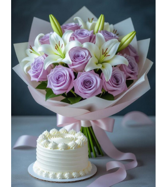 A graceful mix of vibrant blooms paired with a delightful cake, creating the perfect combination of elegance and sweetness for any occasion. A refined choice from flower shop near me, designed to impress.
