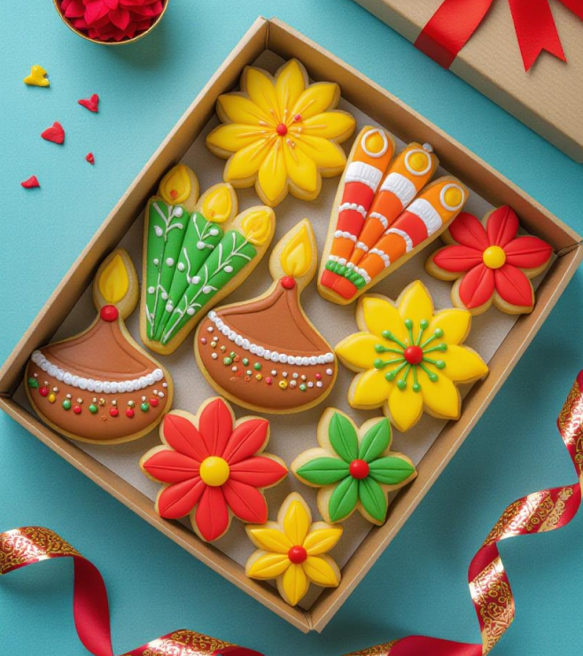 Handcrafted cookies that combine the beauty of diyas, florals, and festive motifs in warm shades of gold, red, and green. Each cookie delivers a perfect balance of flavor and artistry, making it ideal for gifting or gatherings. Available in two sizes: the 10-piece set includes five designed gingerbread and five plain cookies, while the 20-piece includes ten of each for grand celebrations.