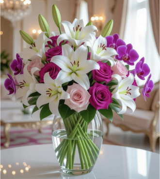 A captivating blend of rich purple roses, delicate pink roses, pure white lilies, and vibrant purple orchids, coming together in a sophisticated arrangement. The interplay of soft and bold tones adds depth and allure, making it a charming choice for expressing appreciation, love, or celebration.