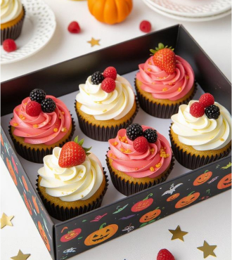 Fluffy cupcakes crowned with silky swirls of pink and white frosting, accented by fresh strawberries, raspberries, and blackberries. The light sweetness and fruity aroma make them a delightful indulgence for Halloween celebrations. Box design may vary based on availability.