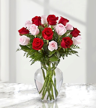 Prepare to be captivated by the Enchanting Rose Ensemble, a breathtaking display of love and admiration. This enchanting arrangement features a harmonious blend of pink and red roses, delicately arranged inside an elegant vase. The vibrant blooms are expertly accented with fresh greenery, adding a touch of natural charm and enhancing the visual appeal. Radiating romance and beauty, this ensemble is a testament to the power of heartfelt emotions and is sure to make a lasting impression on your loved one.