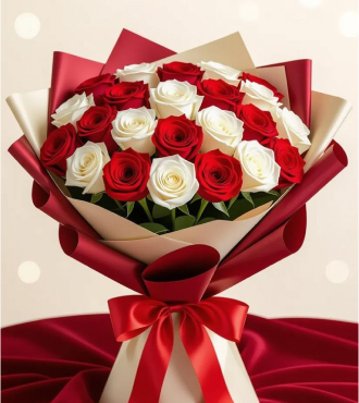 This bouquet features a striking mix of rich red and pristine white roses, beautifully wrapped to highlight their natural contrast. Perfect for romantic gestures, anniversaries, or celebrations of pure love and devotion, easily found at a trusted flower shop near me. Depending on availability, components such as vase or hatbox color and design, may vary.