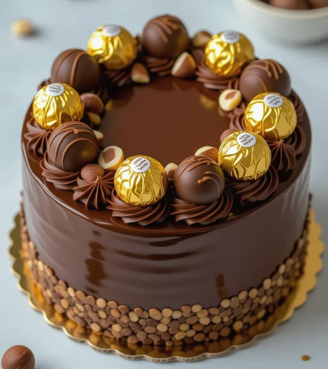 Smooth layers of moist chocolate sponge and nutty ganache form the base for a crown of golden truffles and roasted hazelnuts. Each bite delivers a perfect balance of creamy hazelnut and decadent cocoa richness — a true nod to timeless festive luxury.