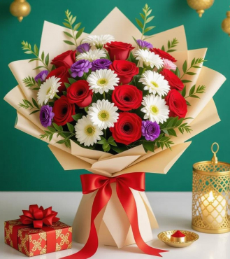 An enchanting bouquet of red roses, white daisies, and hints of purple blooms — wrapped in soft beige paper and tied with a red satin bow. A perfect Diwali gesture that symbolizes prosperity, joy, and new beginnings.