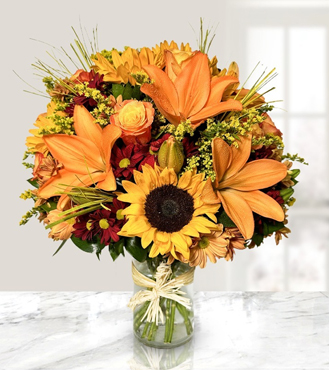 We've captured the festive colors of the harvest season with our Festive Fall Bouquet. Rich orange blooms with golden yellow sunflowers put Autumn's signature beauty on display. Arranged beautifully in our classic vase along with fresh fillers to complement its vibrant beauty.