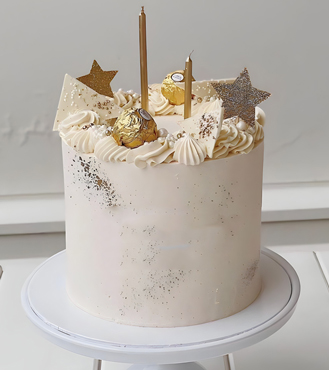 Celebrate the New Year or any festive occasion with this radiant cake, featuring golden accents, edible stars, and a luxurious finish. Topped with Ferrero Rocher and intricate designs, it radiates joy and luxury, making every slice a moment to cherish. Perfect for adding sparkle to your celebrations!