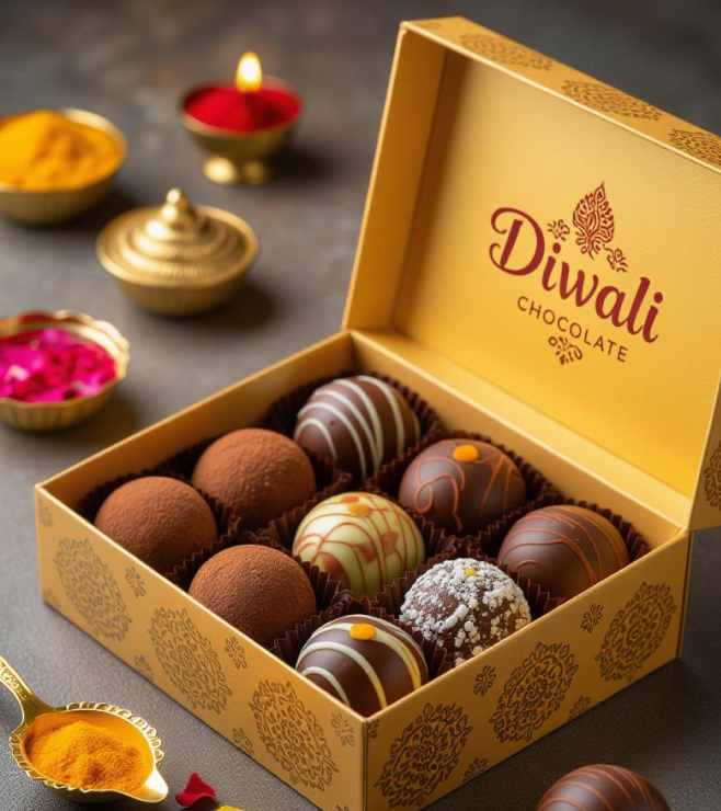 Handcrafted with precision, these premium truffles combine layers of smooth chocolate, soft ganache, and rich cocoa dusting for a decadent melt-in-mouth finish. The perfect expression of Diwali luxury. Box design may vary based on availability.