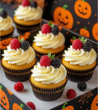 Light and fluffy cupcakes topped with whipped vanilla frosting and garnished with fresh berries. The creamy sweetness pairs beautifully with the tartness of the fruit, making them a refreshing Halloween dessert. Box design may vary based on availability.