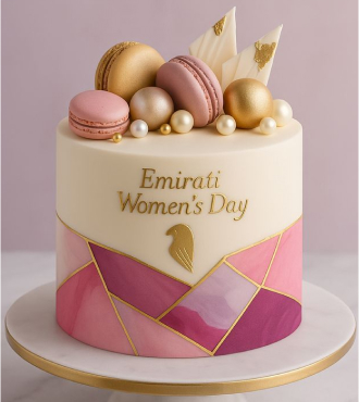 A contemporary masterpiece blending soft cream tones with geometric blush patterns, crowned with macarons, golden spheres, and delicate chocolate shards. Its refined style makes it perfect for marking special moments. Available in chocolate, Oreo, strawberry, red velvet, and Neapolitan flavors, this cake offers both beauty and flavor in perfect balance.