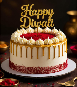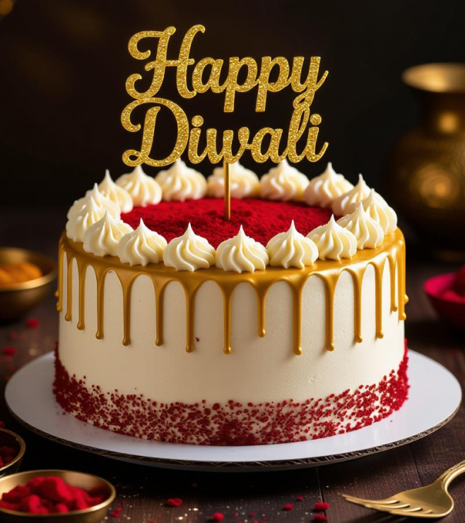 A red velvet masterpiece enveloped in smooth cream frosting, crowned with a golden drip and soft peaks of vanilla. The vivid contrast of gold and red creates a festive showstopper that’s as elegant as it is delicious.