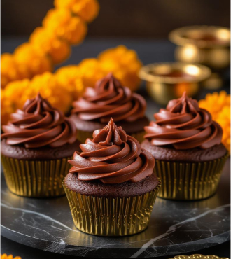 Luxurious chocolate cupcakes adorned with rich swirls of buttercream evoke the golden warmth of marigolds. Soft, velvety, and decadent, they celebrate the spirit of Diwali through texture, color, and irresistible flavor.