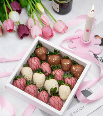 A graceful arrangement of strawberries dipped in shades of blush pink, creamy white, and classic chocolate, accented with elegant gold touches. The smooth finish and artistic drizzle create a refined aesthetic that pairs beautifully with the fresh sweetness of the fruit. Ideal for romantic occasions or sophisticated gifting.
