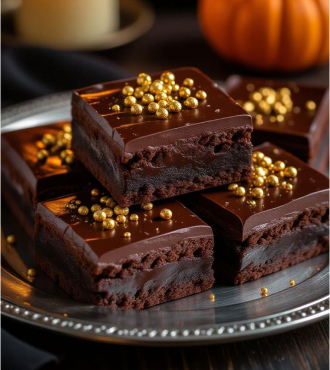 Elegant and indulgent, these brownies are layered with silky chocolate ganache and sprinkled with golden pearls for a touch of Halloween opulence. Their rich cocoa base and glossy finish create a truly luxurious treat for any celebration.
