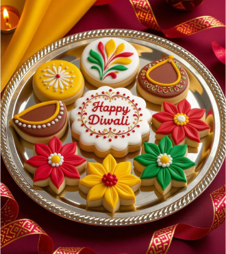 An assortment of cheerful cookies featuring diya, floral, and festive patterns that capture the joy of Diwali. Each cookie offers a soft, buttery base and colorful icing artistry. Available in 10-piece and 20-piece sets, each including a balance of gingerbread and plain cookies.