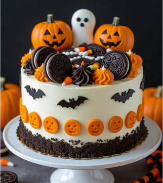 A creamy creation decked with Oreos, pumpkins, and colorful candy. The blend of crunchy cookies and soft sponge delivers a playful texture that’s both fun and flavorful, ideal for sharing during spooky season parties.