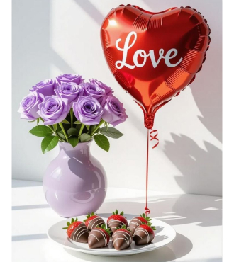 A charming and sweet gift set, perfect for expressing love and thoughtfulness. This refined pairing, gracefully offered through flowers delivery Abu Dhabi, features purple roses, 6 pieces of dipped strawberries, and a heart-shaped balloon.