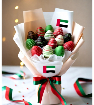 Make your National Day celebration extra special with these elegant UAE-themed dipped strawberries, styled in festive colours that reflect pride and unity. Each piece is crafted to deliver a premium, celebratory feel that elevates any gathering, dessert table, or gifting moment.