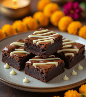 Rich chocolate brownies topped with elegant white chocolate drizzles, balancing sweetness and depth. Each bite feels festive and irresistible, crafted for those who crave classic indulgence with flair.