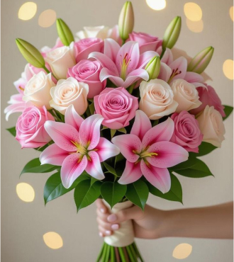 A graceful combination of soft pink lilies and pastel roses, this bouquet exudes elegance and tranquility. Designed to uplift any space or occasion, the blooms are hand-gathered into a radiant arrangement that whispers beauty and warmth with every petal.
